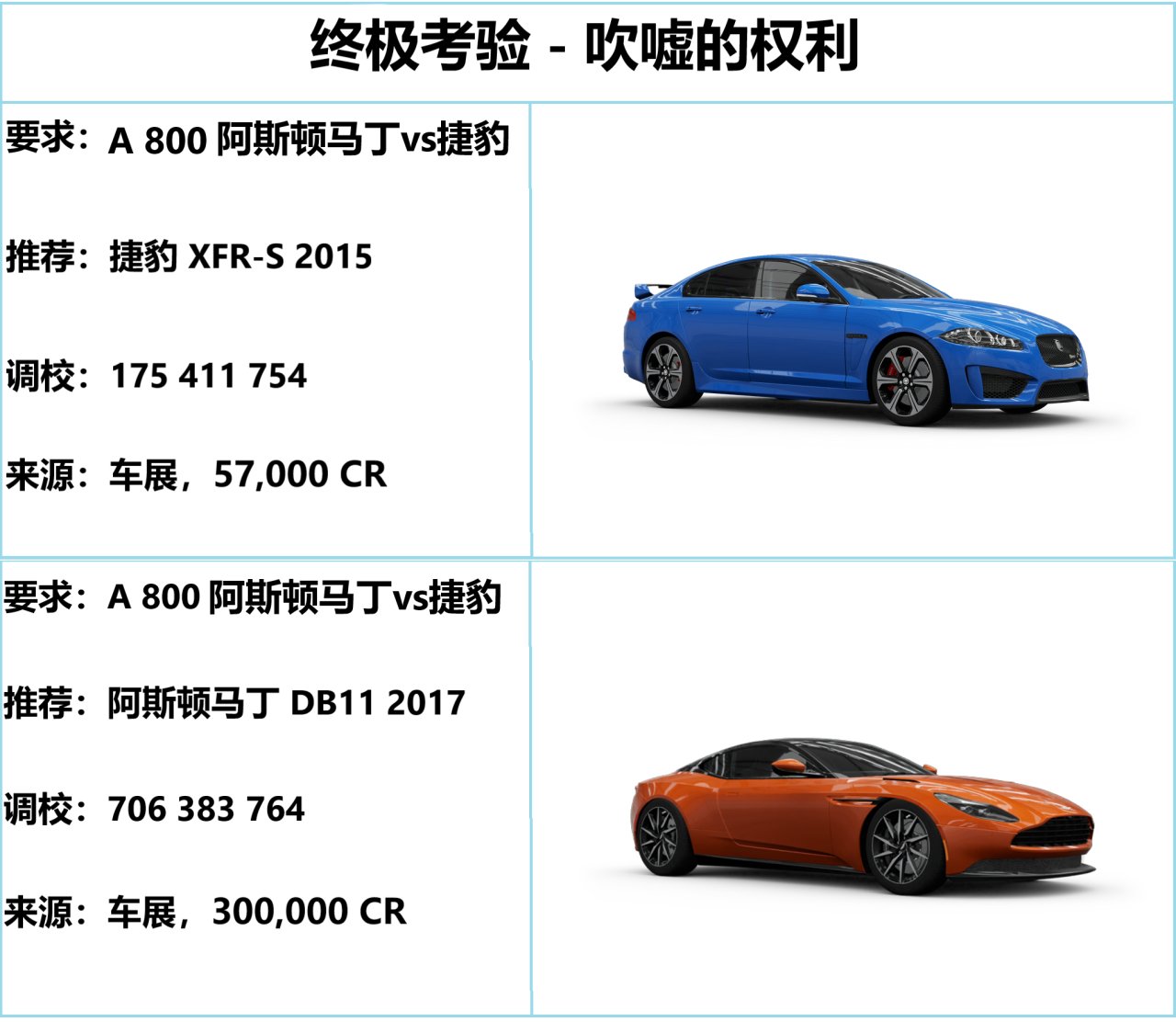 既然是阿斯頓馬丁 vs 捷豹,照慣例就上兩輛車吧。 XFR-S 是大馬力的車型,啓動和加速都很不錯,就是不夠穩(贏得第 1 場錦標賽會送);DB11 則是光頭胎暴力跑法,主打一個贏在直線。