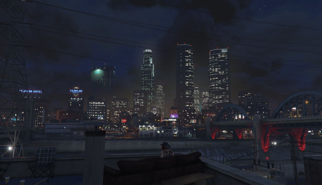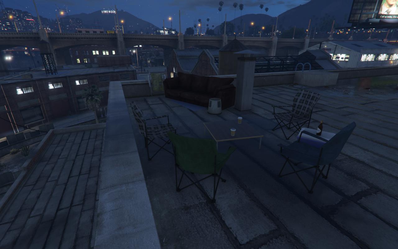 服裝廠樓頂的一角有幾張椅子和一張破沙發,其中沙發正對着中心市區。玩家坐上去這張沙發然後開啓電影視角,能更好地欣賞繁華的夜景。