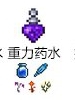 重力藥水(鳥妖羽毛,閃耀根,死亡草,火焰花):前期在寶箱中可以開出,使用後可以按↑鍵顛倒上下,熟練使用的話兩三瓶就可以在前期探索完整個地圖的空島,但是使用時持續下墜也會受到墜落傷害。