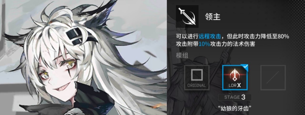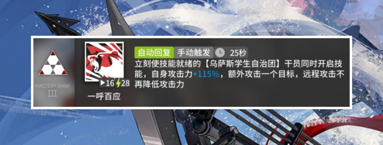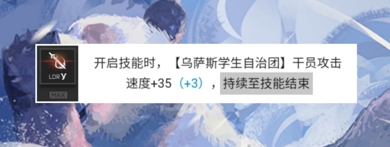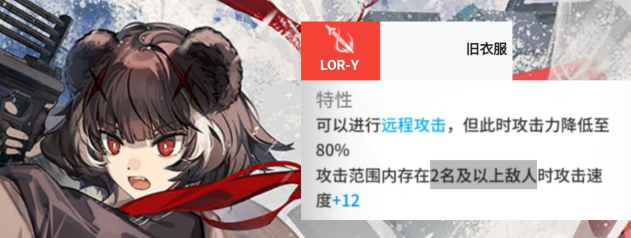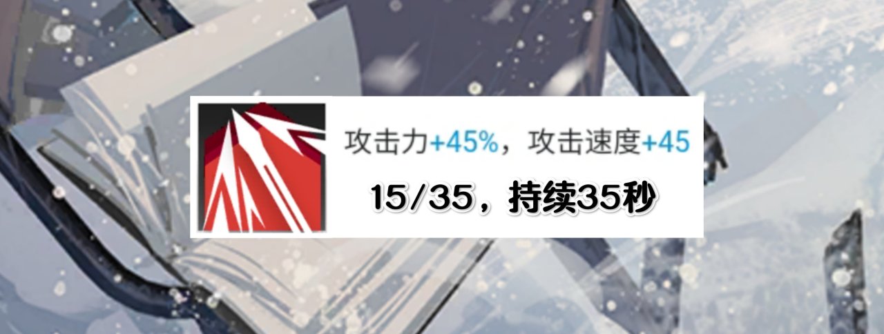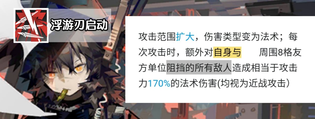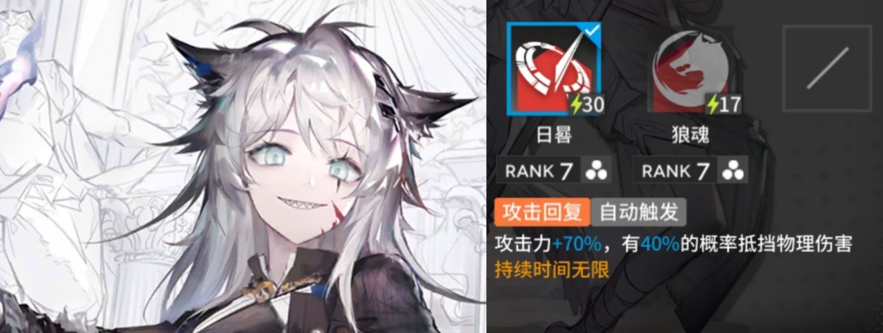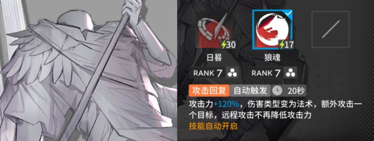 該效果也受到許多博士吐槽,確實作用不大,而且還容易添亂,拋開該效果來看,②技能算是物傷版“狼魂”,專三28技力不高,25秒內同時打2,攻擊力提升至805×2.15≈1731