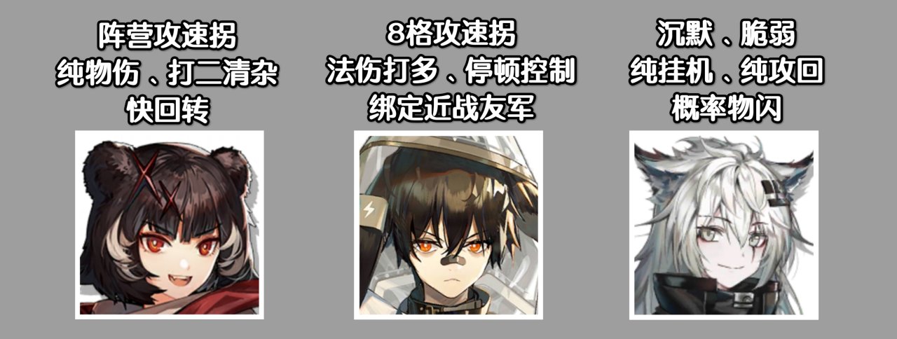 這三個五星領主的天賦效果還都挺強的,拉普蘭德7秒沉默+脆弱,直接施加兩種效果,斷崖不限制特定幹員的8格羣體加攻速,近衛版琴柳,烈夏雖然限陣營,但35攻速很高