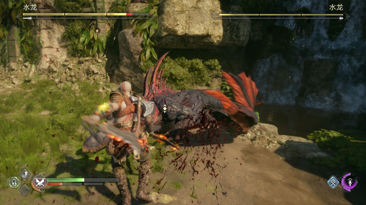 《戰神諸神黃昏》這次提供了三種武器,斧、刃、矛。三把武器的手感都異常的舒服,斧頭的重力頓挫感很舒服,每一斧子都能感受到該有的重量與力度;而刃則很好的體現了速度,進攻快速有力(但也經常收不回來);而新增的矛也把矛的突刺感做得很好,每一次進攻都能有很好的反饋。