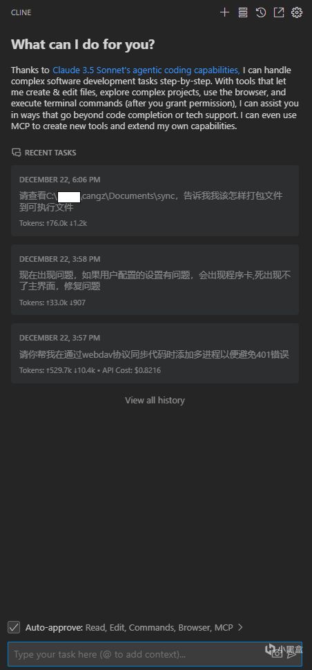 後來接觸到Cline(以前叫Claude Dev),這是一個集成在VS Code裏的AI開發插件。Cline的亮點在於它不僅可以寫代碼,還能自動配置環境、分析日誌、修Bug,真的震驚到我了!在Cline的幫助下,我用Claude Sonnet模型一步步完成了整個程序開發,體驗比Cursor好太多。