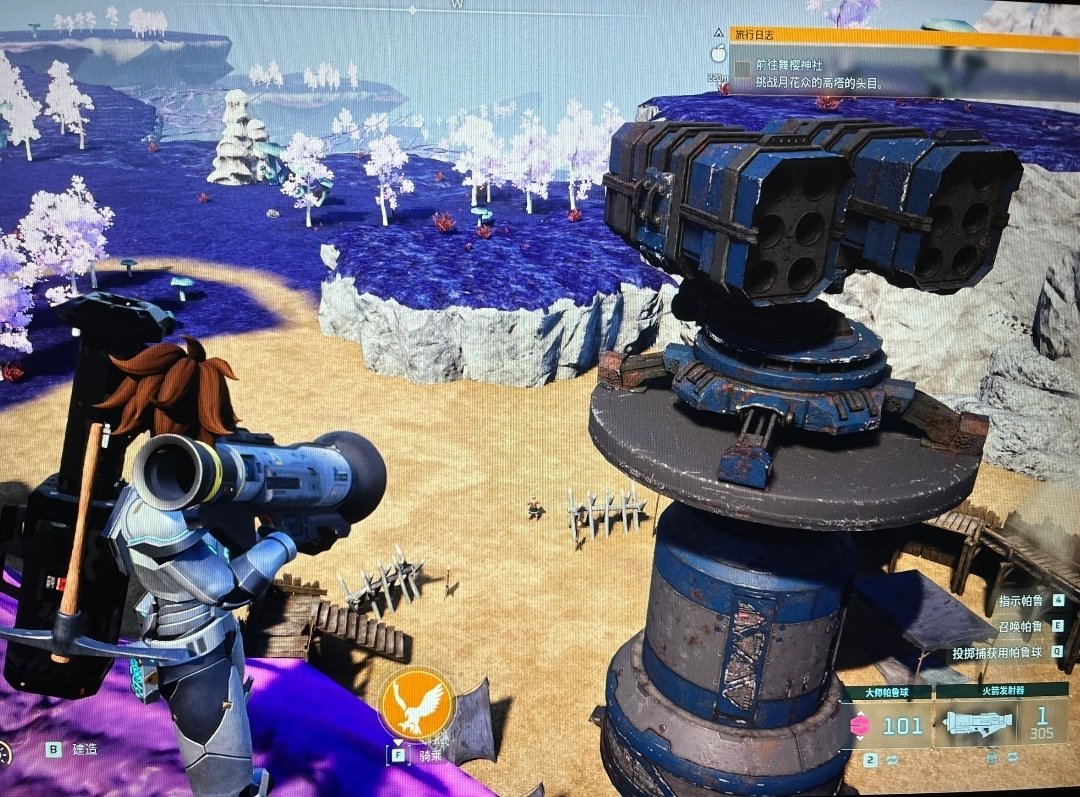 上島之後,我們不能用飛行帕魯,比如“空渦龍”。使用飛行帕魯會被擊落的!因爲“天墜之地”如它的名字一樣。在天上就得墜下來。天墜這個地方有很多炮臺。我們需要找到冒煙的地方,這裏就是有炮臺的位置。炮臺附近一般有天墜之民,需要慢慢的解決完之後。再去拆掉炮臺,然後才能繼續在這片區域使用飛行帕魯!
