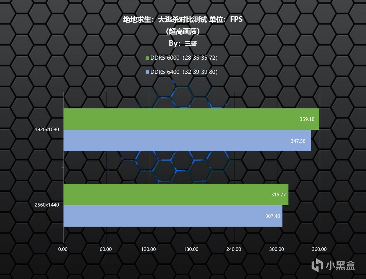 在《絕地求生:大逃殺》測試中,DDR5 6000(28 35 35 72)相較DDR5 6400(32 39 39 80)取得了不小的領先,其中在1920x1080分辨率下取得了11.6幀的領先優勢,在2560x1440分辨率下取得了8.37幀的領先優勢。