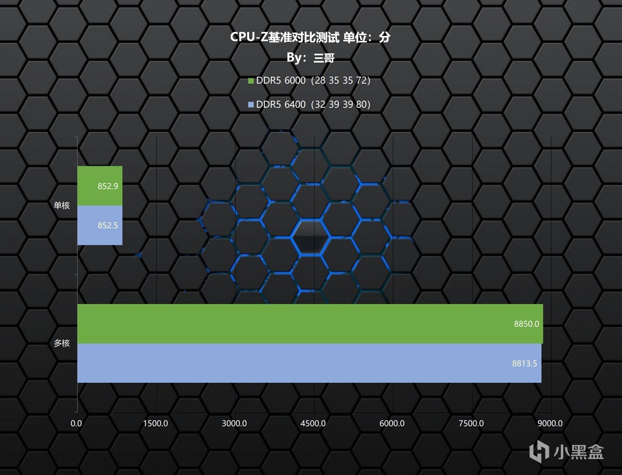 在該測試中,DDR5 6000(28 35 35 72)相較DDR5 6400(32 39 39 80),單核和多核性能均有小幅度的領先。
