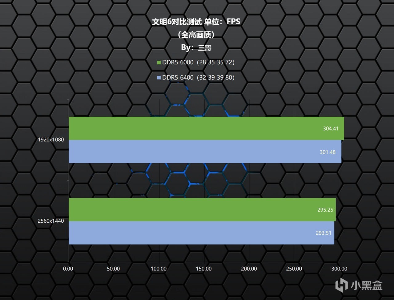 在《文明6》測試中,DDR5 6000(28 35 35 72)相較DDR5 6400(32 39 39 80)取得了一定幅度的領先,其中在1920x1080分辨率下取得了2.93幀的領先優勢,在2560x1440分辨率下取得了1.74幀的領先優勢。