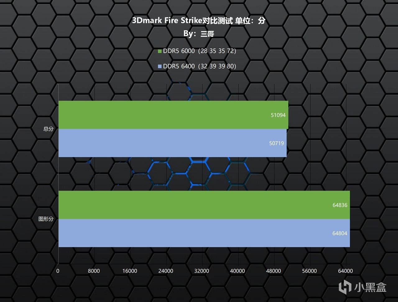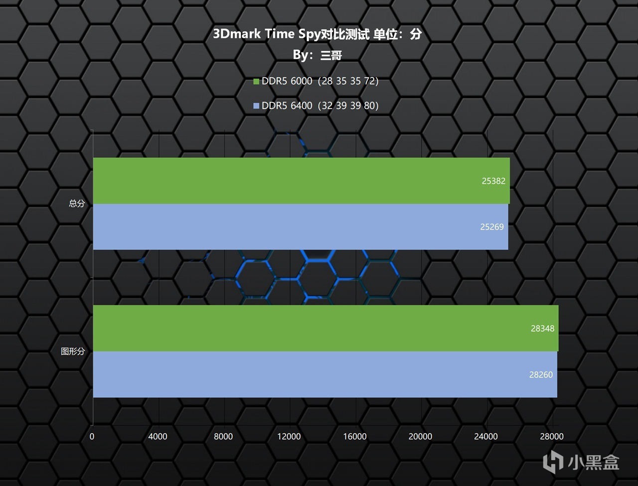 在該測試中,DDR5 6000(28 35 35 72)相較DDR5 6400(32 39 39 80),總分和圖形分均有小幅度領先。
