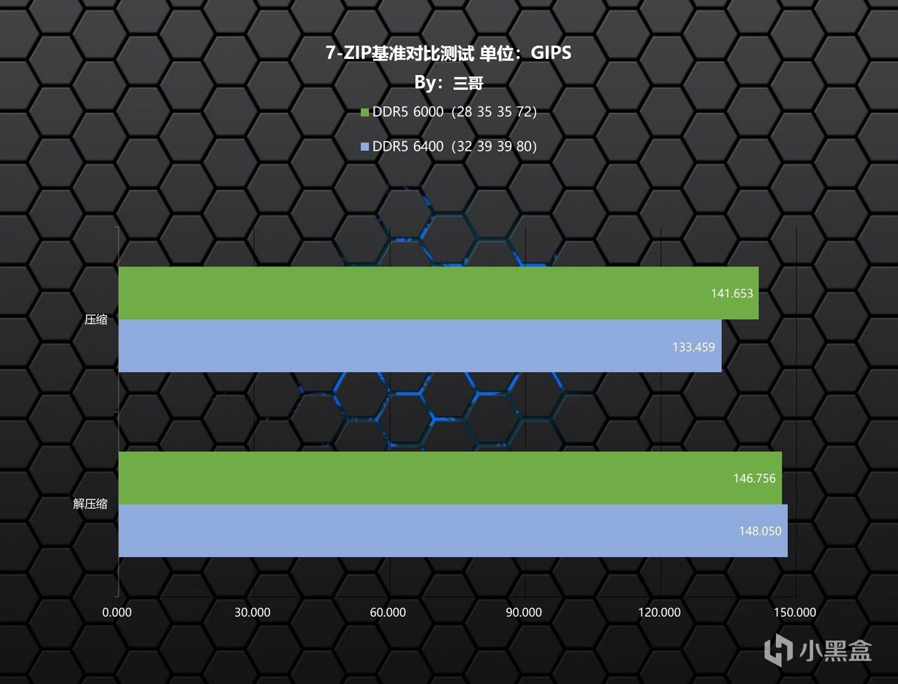 在該測試中,DDR5 6000(28 35 35 72)相較DDR5 6400(32 39 39 80),壓縮性能有較大幅度領先,但解壓縮性能略有落後。
