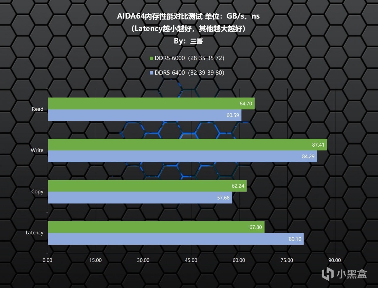 在該測試中,DDR5 6000(28 35 35 72)相較DDR5 6400(32 39 39 80),內存的讀、寫和複製性能提升均有較爲明顯的領先,同時延遲也大大降低。