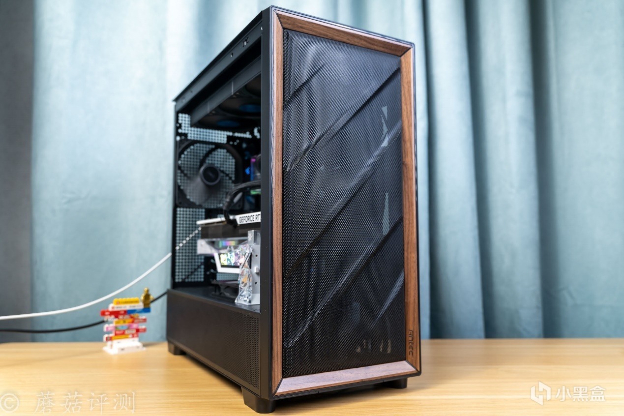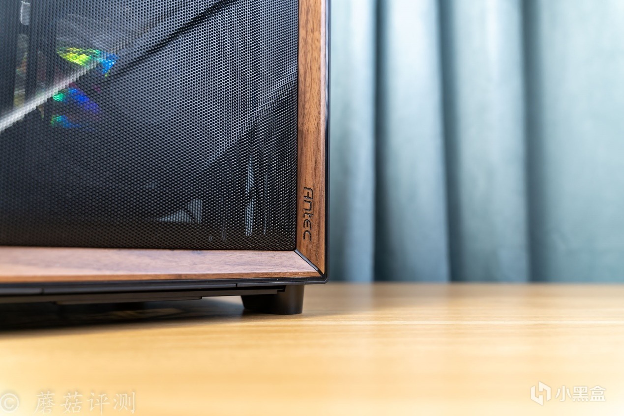 ▼機箱前部有一圈實木裝飾,胡桃木材質的,觸感和質感都非常不錯。另外在右下角,還有安鈦克的LOGO,做工挺細膩的。