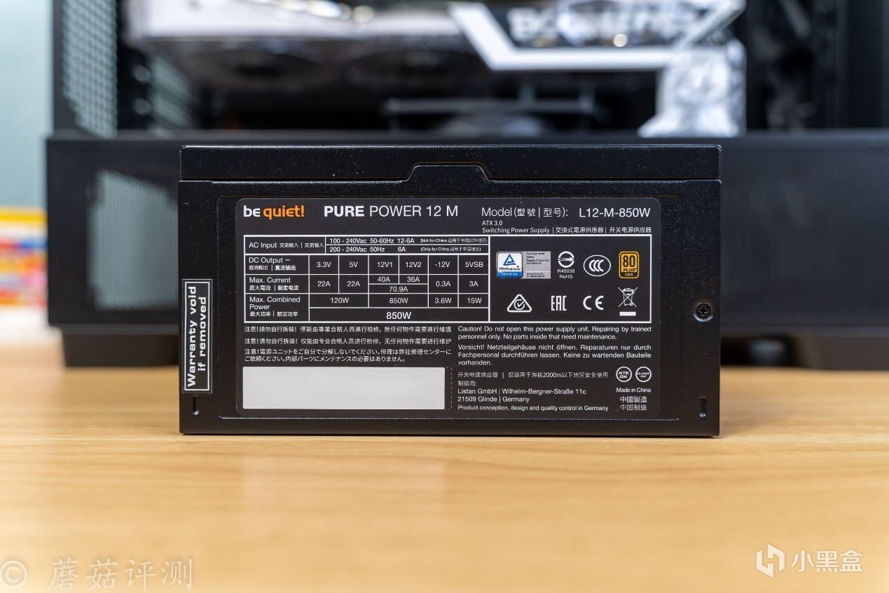 ▼另一側是電源的詳細參數表,這款電源額定功率850W,+12V最大輸出功率在850.8W左右,表現不錯。另外,這款電源支持寬幅輸入,擁有80Plus金牌認證。