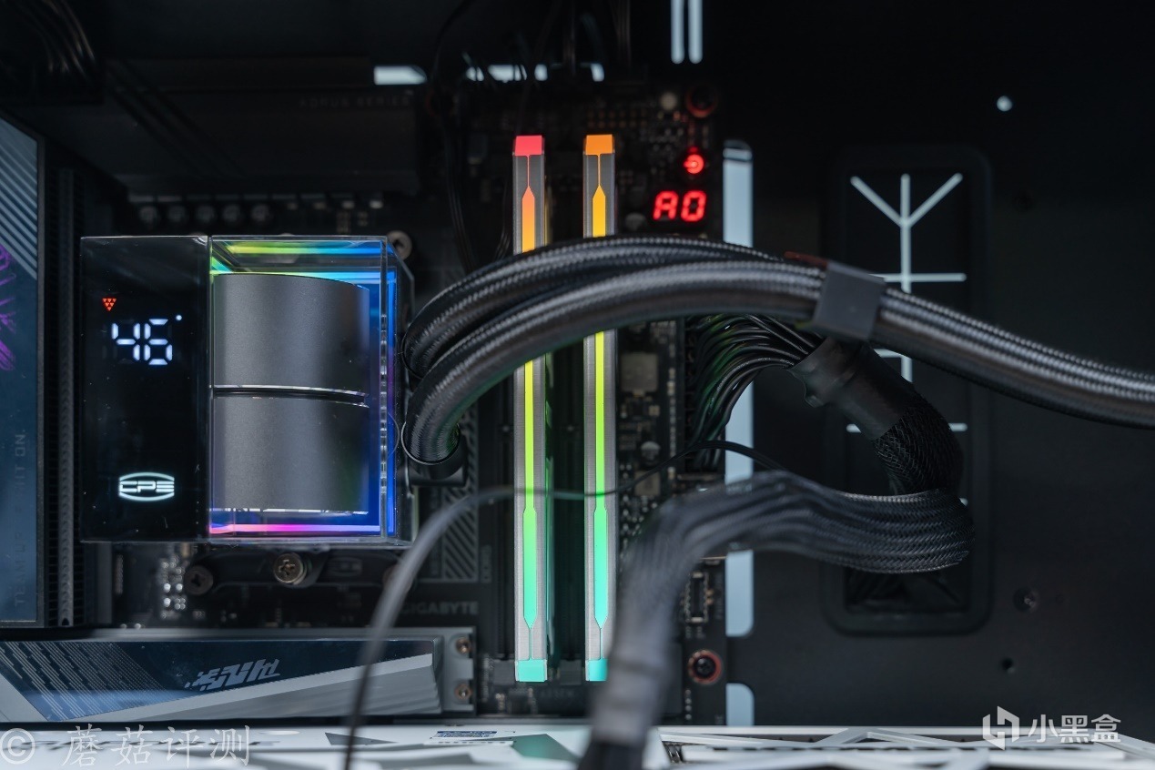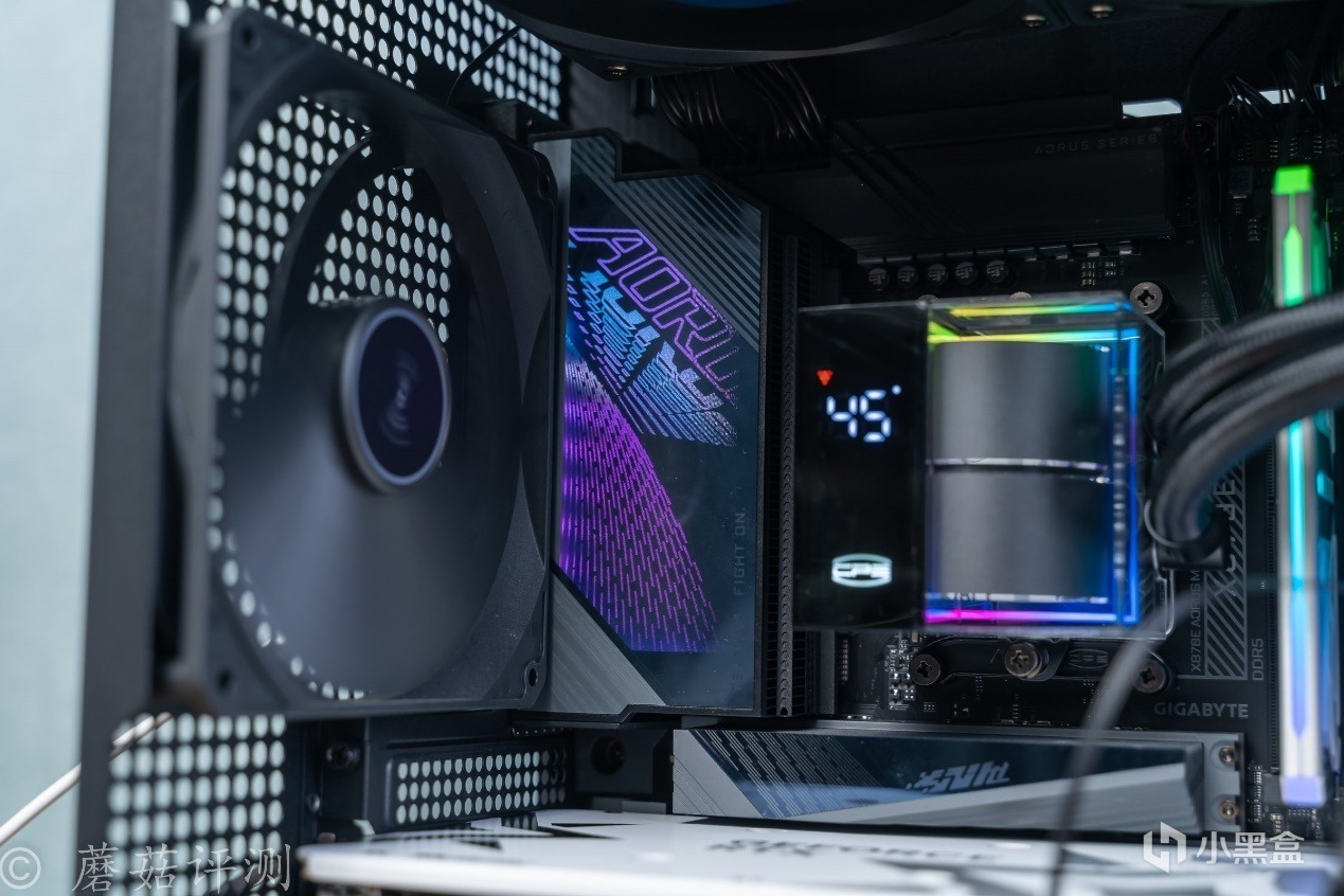 ▼超頻三這款水冷的水冷頭特別好看,頂部右側的透明頂蓋內部,有一圈RGB燈環,支持ARGB燈效,顏色過渡均勻。左側是一個數顯模塊,中間會實時的顯示處理器的溫度。