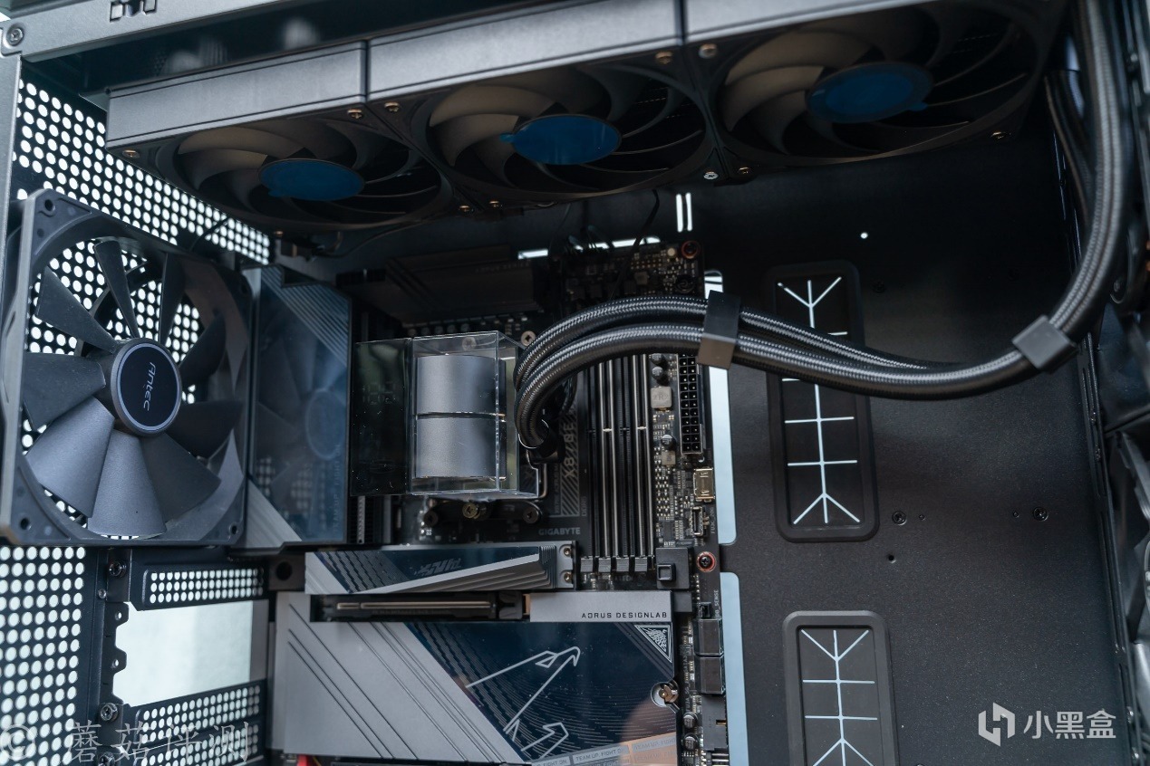 ▼水冷頭輕鬆固定,水冷排安裝到機箱的上部。這款水冷的水冷頭有點像藝術品的感覺,外面透明的罩子很有那味。