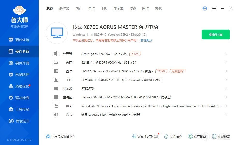 ▼整機配置一覽,處理器是9700X,主板是技嘉的X870E MASTER超級雕,顯卡是影馳的RTX4070 Ti Super星曜OC,整機配置很不錯。
