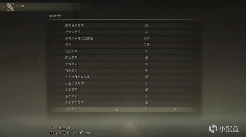 以《艾爾登法環》爲例,調整貼圖質量和反鋸齒品質以平衡畫面觀感和幀數,其他設置調至最低以優化性能。