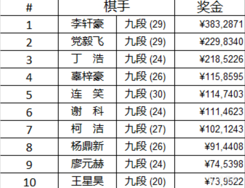 今年中國棋手年終獎金前十名,柯潔以102萬的收入排在第七,不過算上今年榮耀手機幾家公司的贊助和柯潔自己的投資項目,年內總收入遠不止百萬,今年第一名爲李軒豪九段,主要是夢百合杯冠軍的180萬和王中王的100萬,第二名黨毅飛勝在穩定,夢百合亞軍、國內爛柯杯冠軍、三星杯亞軍和南洋杯四強;第三名丁浩主要是三星杯進賬160萬;前十名中年齡最大的是連笑,雖然世界大賽一冠難求,但憑藉多年的穩定發揮,獎金依然達到114萬比柯潔還要高兩位。