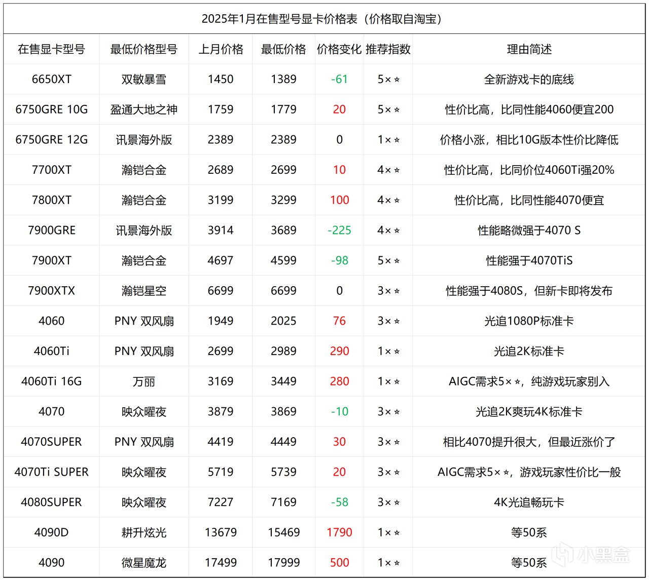 本月顯卡價格相比上個月大部分型號價格上漲,中端熱門型號4060Ti漲幅比較大,AMD這邊的7900GRE和7900XT降幅還可以目前性價比不錯,4090/4090D因爲停產價格還在大漲,不過很快5080和5090就出來替代這兩了。