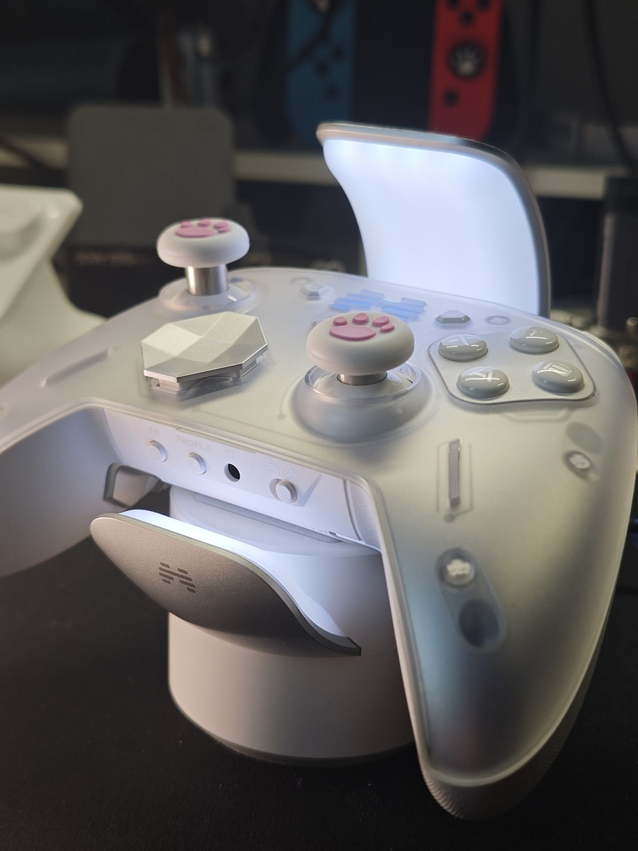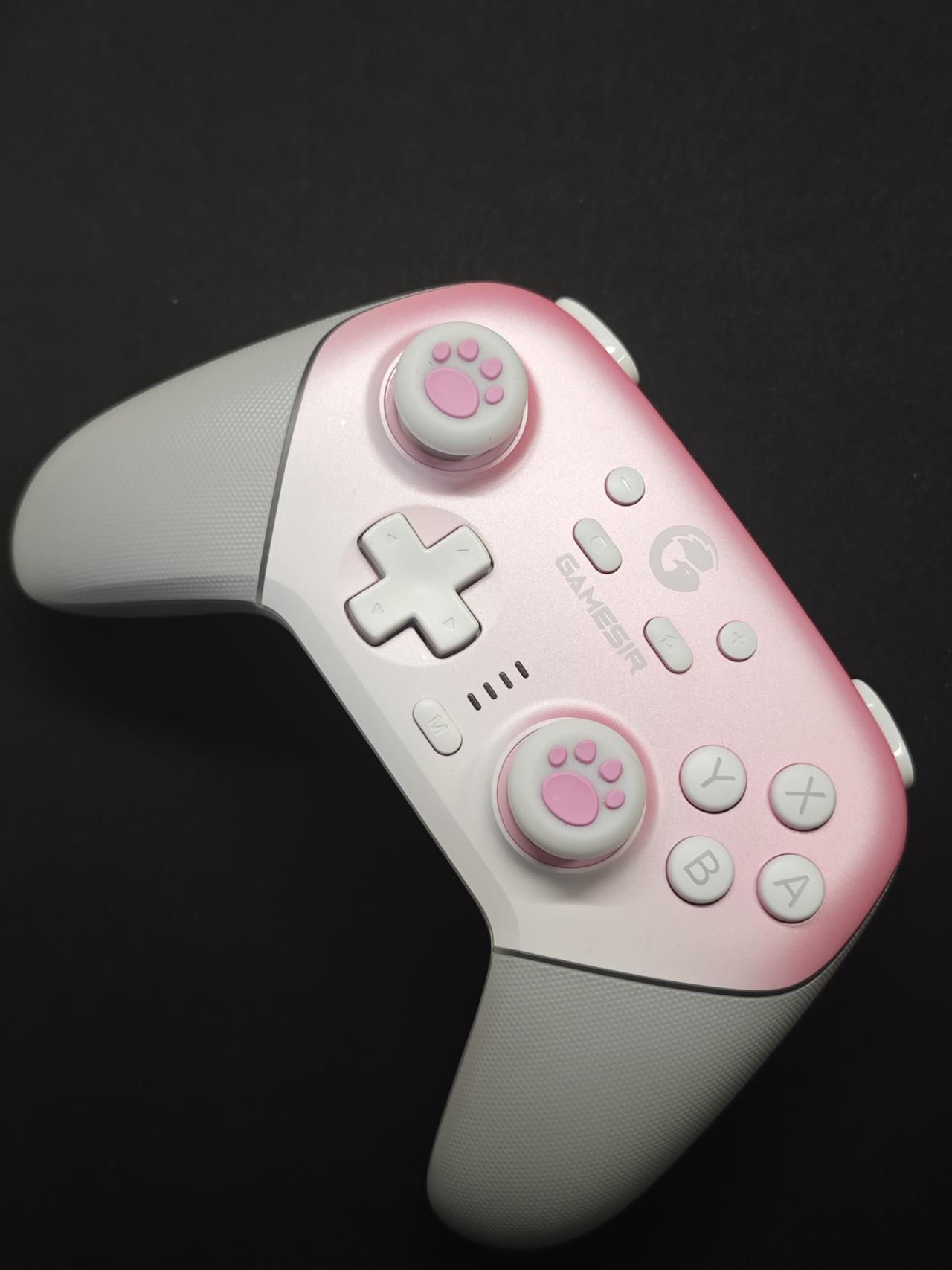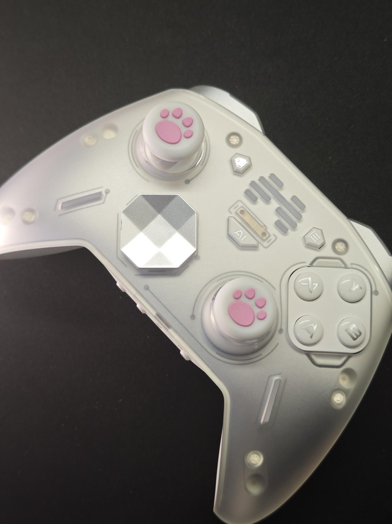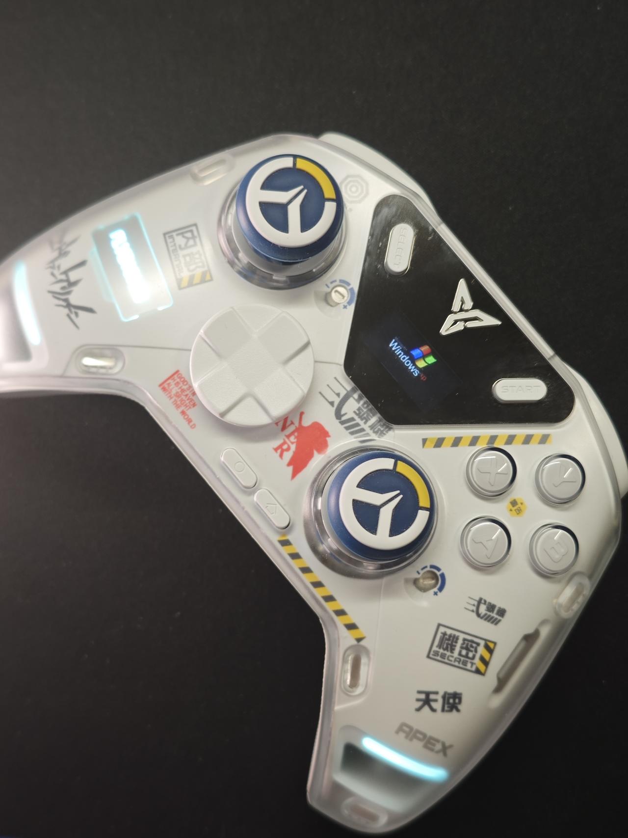 先說優點:他這個自適應扳機,真是深深深深得我心,雖然達不到ds5那麼完美,但是我真的非常非常喜歡,力度似乎比pc端的ds5更大一點。嗷對,他這個自適應扳機我覺得非常值得多說一點,就是他除了自適應扳機以外,還有三個模式,就是扳機振動、扳機鎖、阻尼;他這個扳機震動和其他所有扳機振動不一樣,就是他振動會頂你的手,沉浸感upupup;然後扳機鎖模式,他是靠阻尼大小來實現的,所以可以255無極扳機鎖,想啥時候到底就啥時候到底,但也就因爲是阻尼,所以導致達到觸發點之後和阻尼模式最大阻尼是一模一樣的;這個阻尼模式就是可以調節你扳機按壓的力度,特別適合玩賽車,更精準控制油門剎車。然後就是他的顏值,rgb燈光,自定義屏幕,還有霧透面殼,鏤空馬達,真的是非常好看;說實話,我買手柄是真的顏值黨~(嘿嘿嘿,大賽米一枚),當然我的這個因爲自己微微diy了一下,貼了點Eva的水貼,所以初始形態就得去別地方看看了,但也就因爲這個純白麪殼,你可以肆無忌憚的聯名,只要你技術好,當然和我聯名也可以(嘿嘿嘿,雖然我現在還不是個ip,不值得。但夢想總是要有的)。再就是他這個十字鍵手感,他們叫轉軸十字鍵吧,好像是,具體啥技術不清楚,畢竟咱是單純的體驗黨;反正總而言之,他這個十字鍵是我用過所有裏邊最好的!大拇指放中間來回轉真是非常解壓!再就是他這個按鍵手感,我覺得也是我用過所有按鍵裏最好的,比普通的微動按鍵更輕一些,但是沒有宙斯二光軸那麼那麼的輕,反正我很滿意~。最後就是他這搖桿,他們說是合金啥啥啥搖桿,具體性能咋樣我不知道,但是這個手感,推上去,duang一聲回來,真的好解壓~