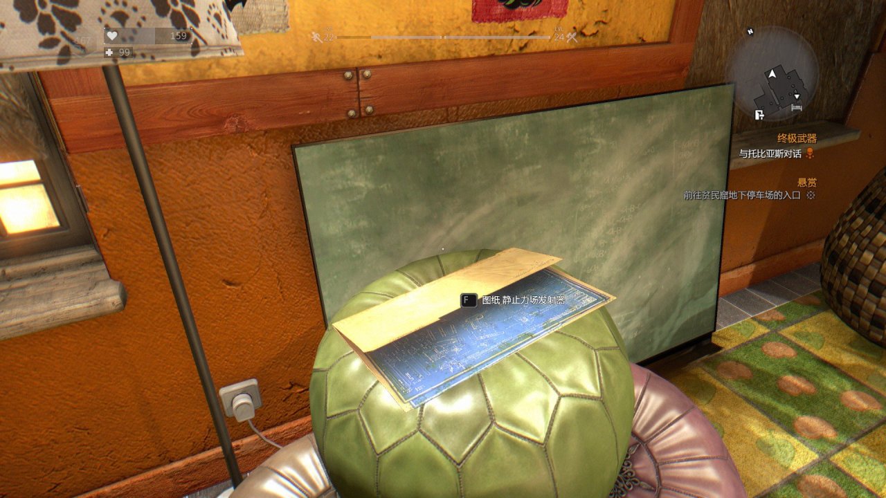 獲取位置:想拿這個圖片首先要把主線任務做到廣播站這裏,解鎖天線區這個地圖,接着來到我所標記的這個地方,這裏記得先補滿血再下去,圖紙在水下面那個有毒的箱子裏(那個會發光的)