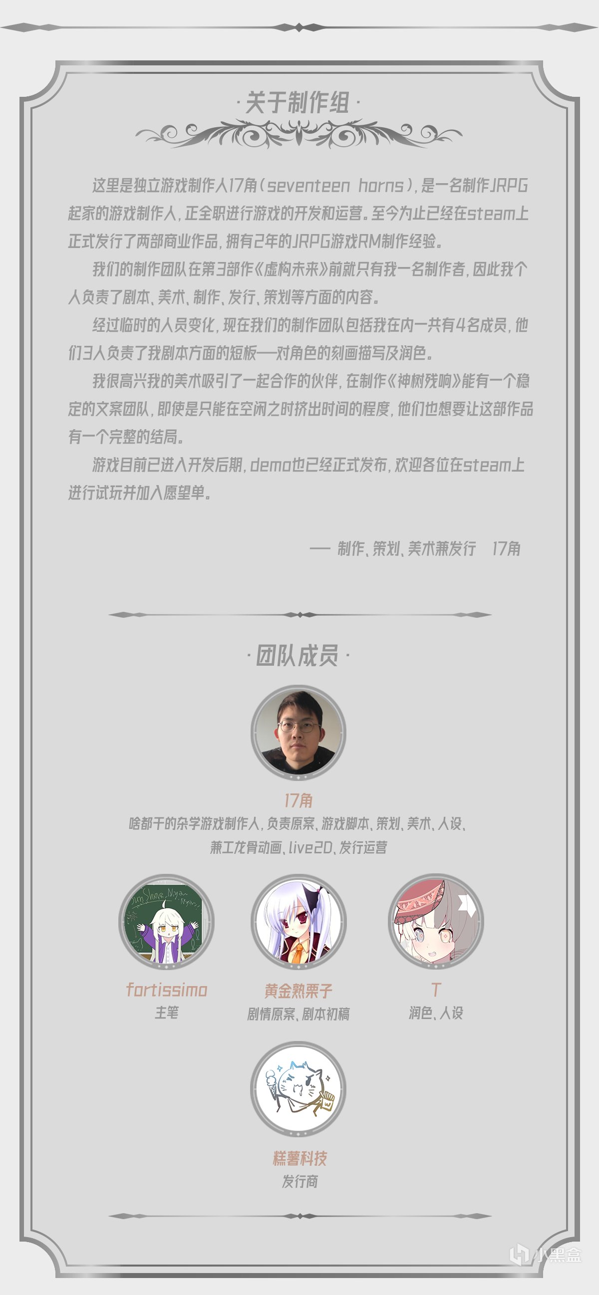 製作者17角之前是一個人做了兩部前作,這一作加入了三位新的小夥伴,彌補了17角在劇情上的短板,所以《神樹殘響》應該會是各方面比較均衡的作品。(當然角色立繪和CG可以給到出色的評價)