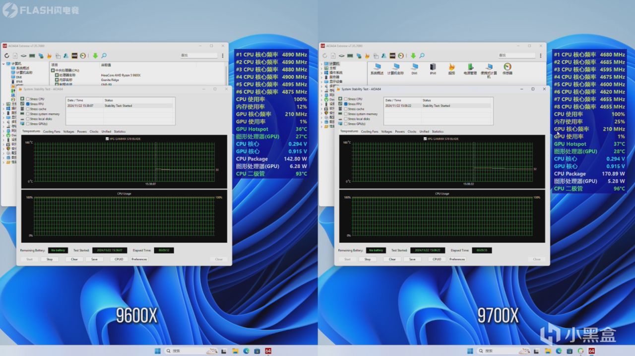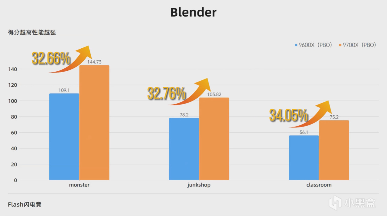 首先在三維動畫製作軟件《Blender》測試中,9700X三項成績分別領先9600X 32.66%、32.76%和34.05%,與我們之前測試的理論性能情況基本一致;