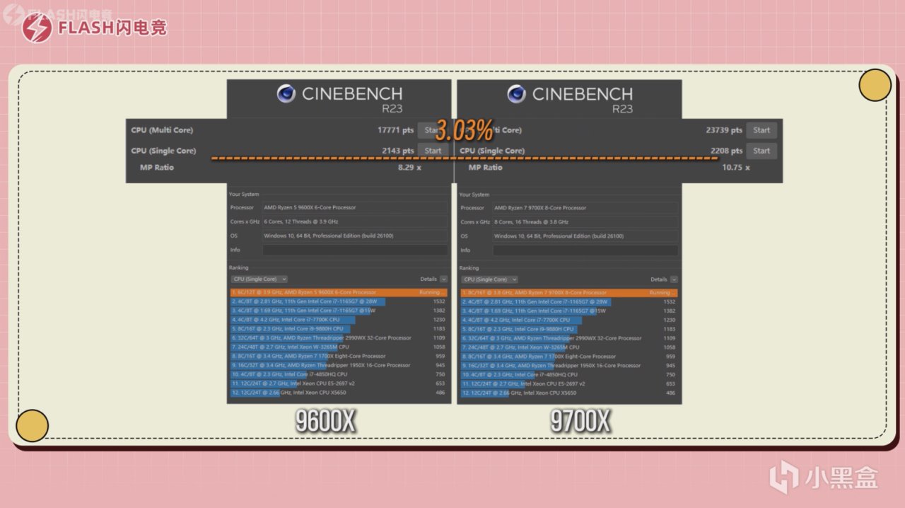 綜合來看,理論性能這邊,9700X單核領先差不多1.6%,多核領先31.45%左右。