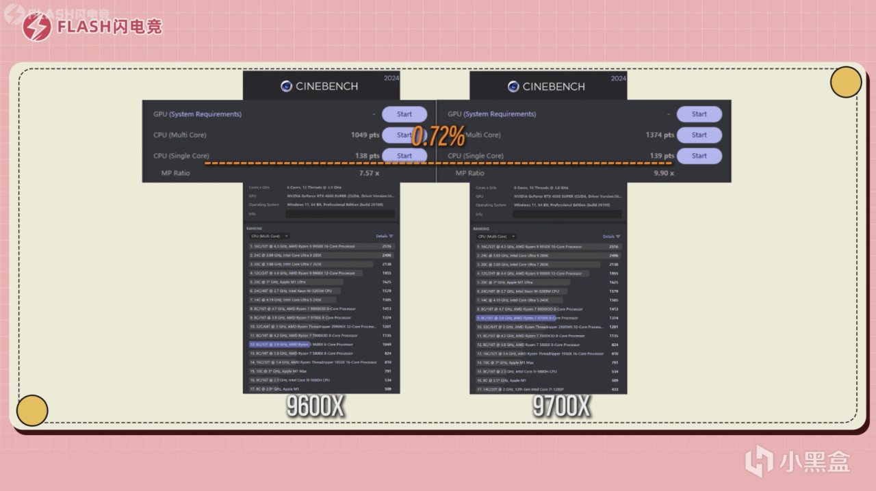 在CINEBENCH 2024中差距略微縮小,單核領先0.72%幾乎可以忽略不計,多核領先30.98%;