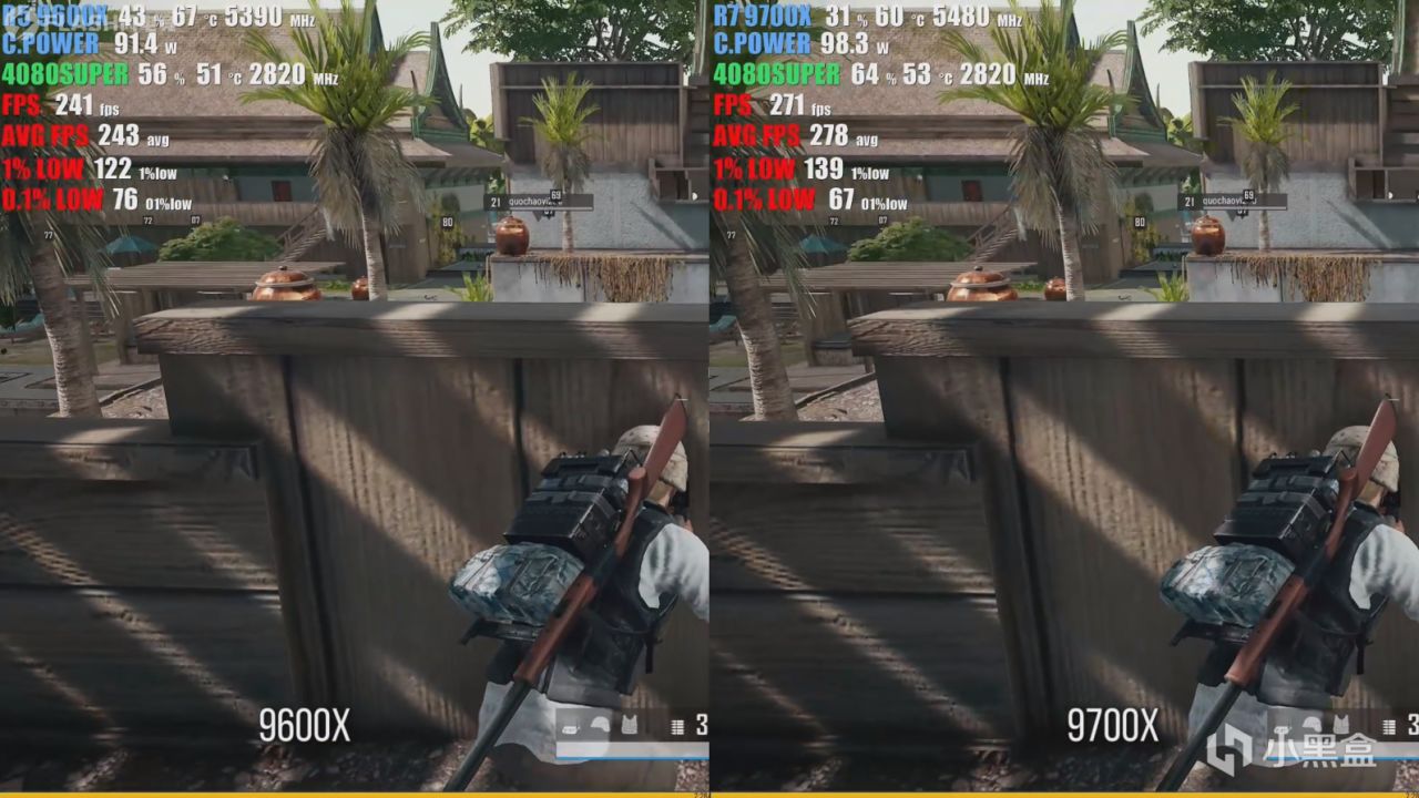 然後是《PUBG》絕地求生,這裏9700X相比9600X就有一個非常可觀的領先了,平均幀高了31幀,領先12.4%,LOW幀高了13幀,領先8.78%;
