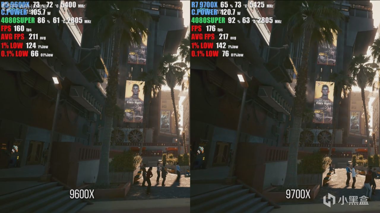接下來是三款3A大作,在《賽博朋克2077》中,9700X不管是平均幀還是LOW幀,都有着不錯的優勢,其中平均幀高9幀領先4.48%,而LOW幀更爲誇張,高了接近20幀領先來到16.24%;