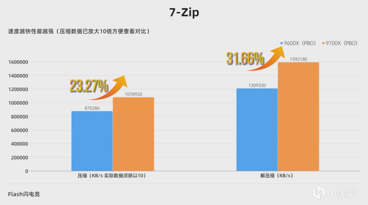同樣的還有《7-Zip》壓縮解壓縮測試,壓縮速度9700X領先23.27%,解壓縮領先31.66%;
