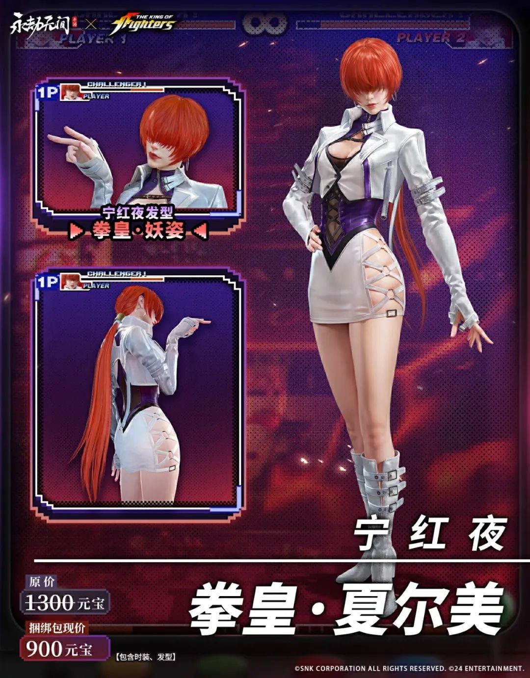 2、新增寧紅夜捆綁包【拳皇·夏爾美捆綁包】。捆綁包內含寧紅夜極品時裝【拳皇·夏爾美】、寧紅夜極品髮型【拳皇·妖姿】。捆綁包原價1300元寶,折扣價900元寶。單獨購買對應單品即可享受折扣,購買捆綁包將享受更多折扣。