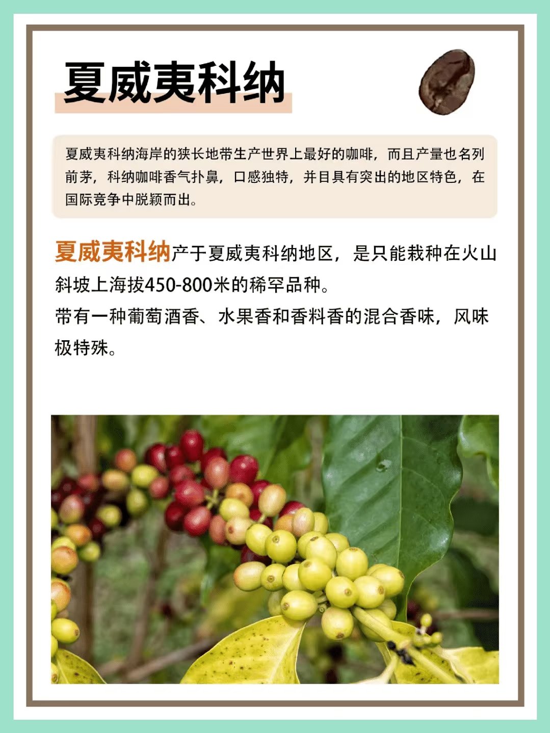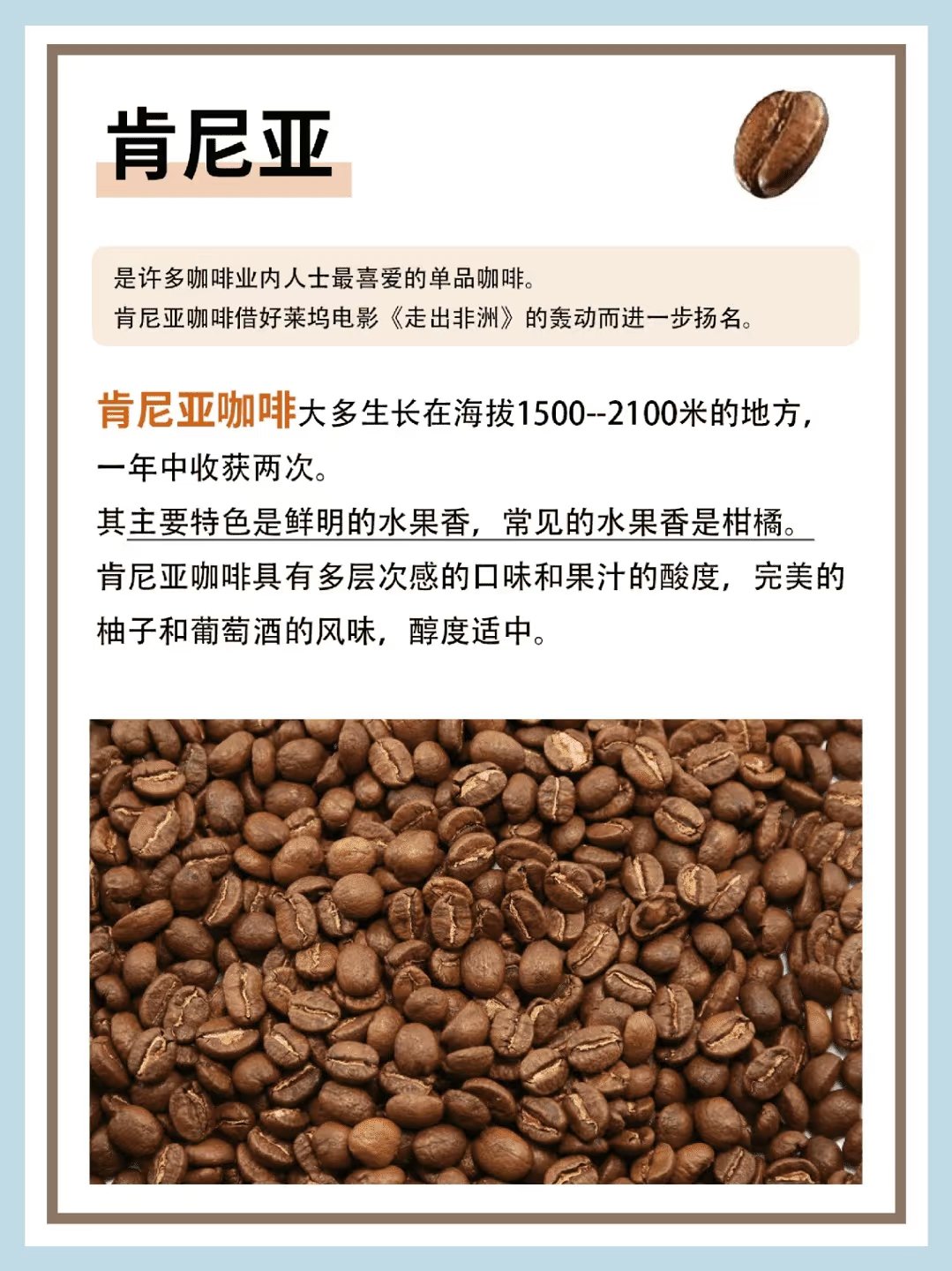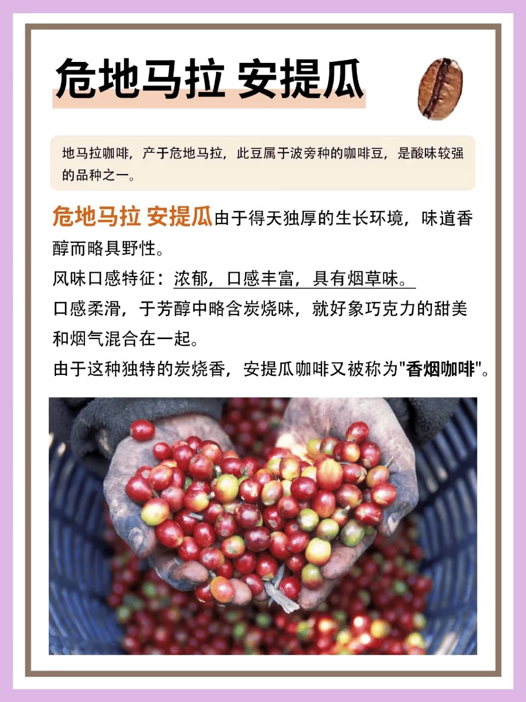 它以其濃郁而醇厚的獨特風味著稱,略帶微酸,特殊的種植條件及溼刨法加工賦予了它果木香氣與焦糖甜味,喝完後留有持久甘甜回味,非常適合亞洲人的口味偏好。