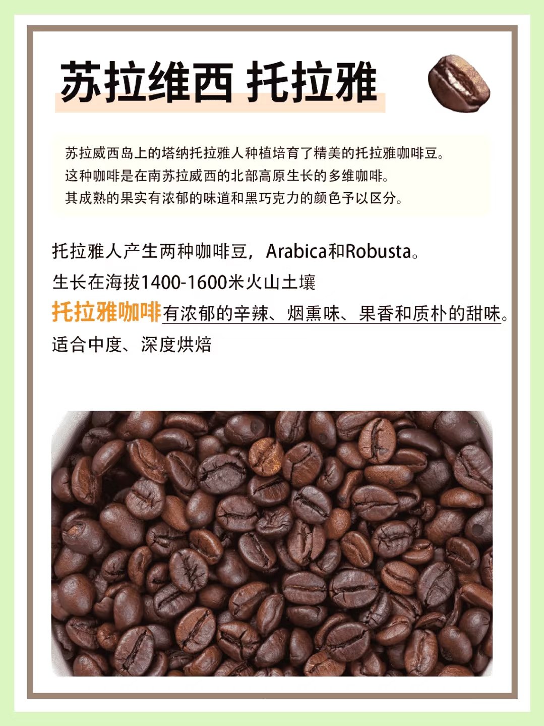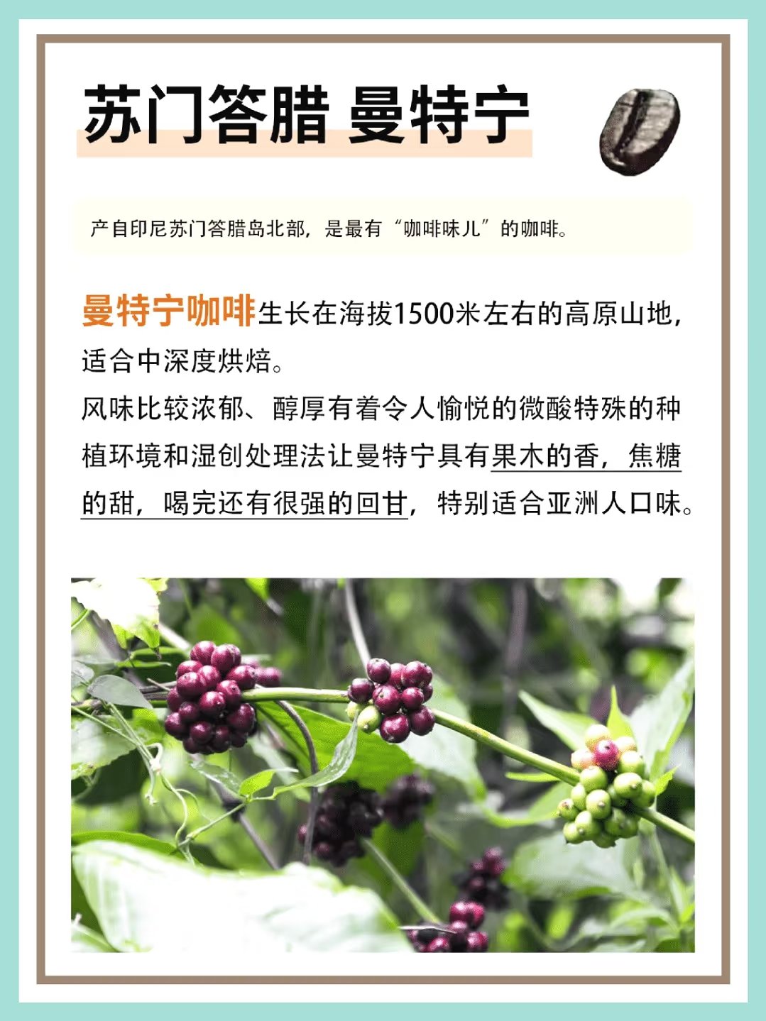 來自印尼蘇門答臘島北部,被譽爲最具“咖啡味”的咖啡之一,曼特寧咖啡生長在海拔約1500米的高原山地區域,適合中深度烘焙處理。