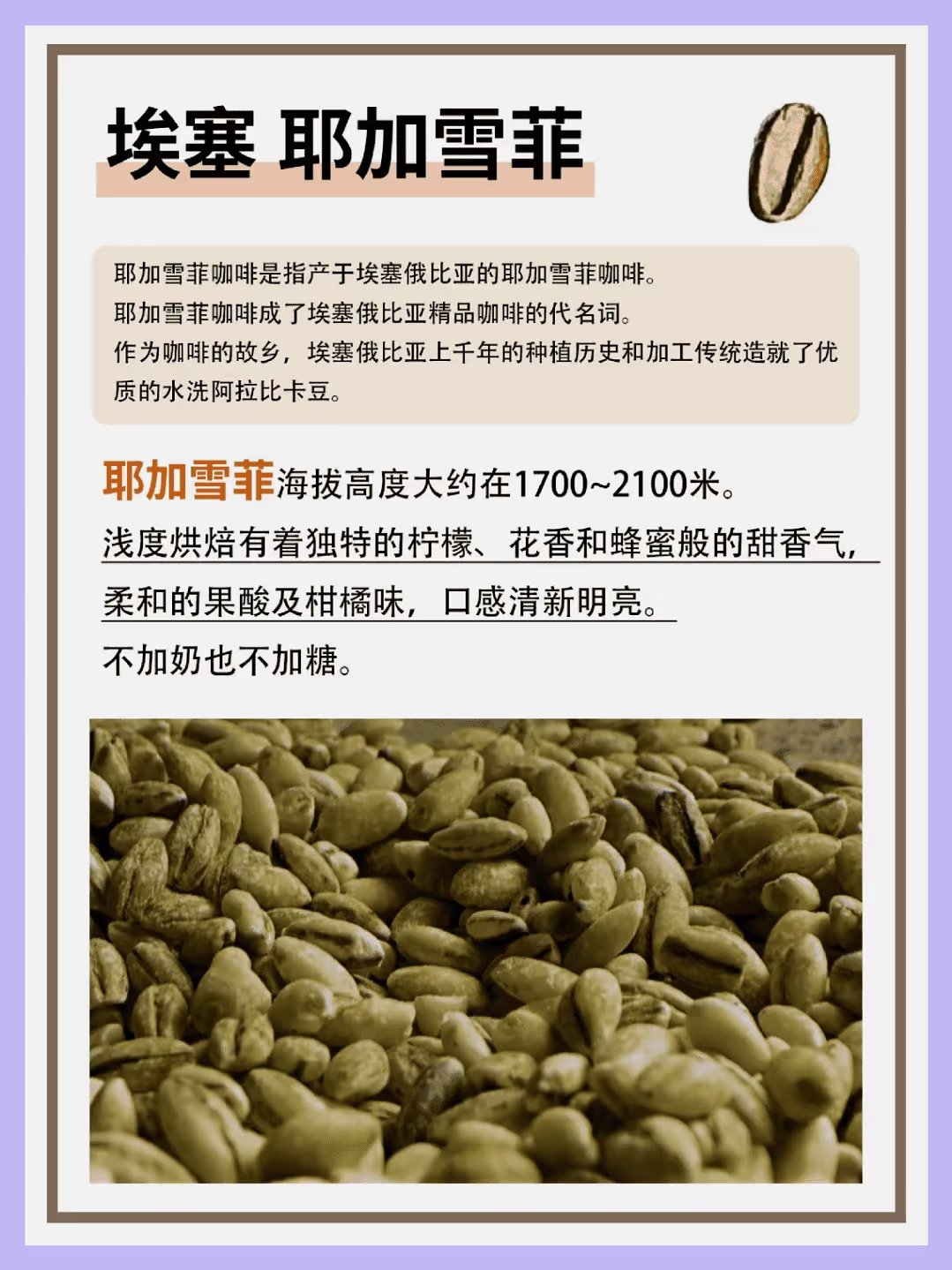 耶加雪菲指的是產自埃塞俄比亞的一個小鎮耶加雪菲地區所產的咖啡豆。該地區成爲了埃塞俄比亞優質咖啡的代名詞。作爲咖啡發源地之一,埃塞俄比亞憑藉其悠久的種植歷史與精湛的加工工藝生產出了高質量的水洗阿拉比卡豆。