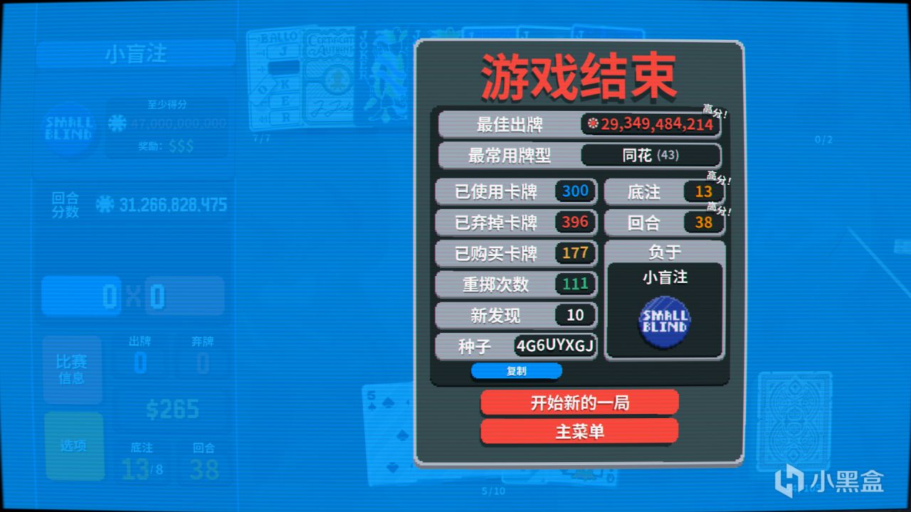 在滿足感驅使下,玩家熱衷於發掘一張張卡片的效果,並在無限模式中向之前從未達到過的高分發起衝擊。剛玩的時候,筆者曾有一把“同花爽局”,屏幕前的小丑在重複打出的牌型、持續燃燒的數字、購買未發現卡牌並不斷重擲等影響下很快感到麻木,放棄了思考與運營,直至小盲注打到最後一次出牌時,發現分數要求似乎比三千萬多了個零而大跌眼鏡。自此之後,筆者的每一個操作都會認真思考(雖然還是經常倒在3億的小盲註腳下)。這樣的發掘新體驗、衝擊新高峯的遊戲驅動力使得遊戲壽命大幅延長,也讓《小丑牌》展現出其獨特的魅力。