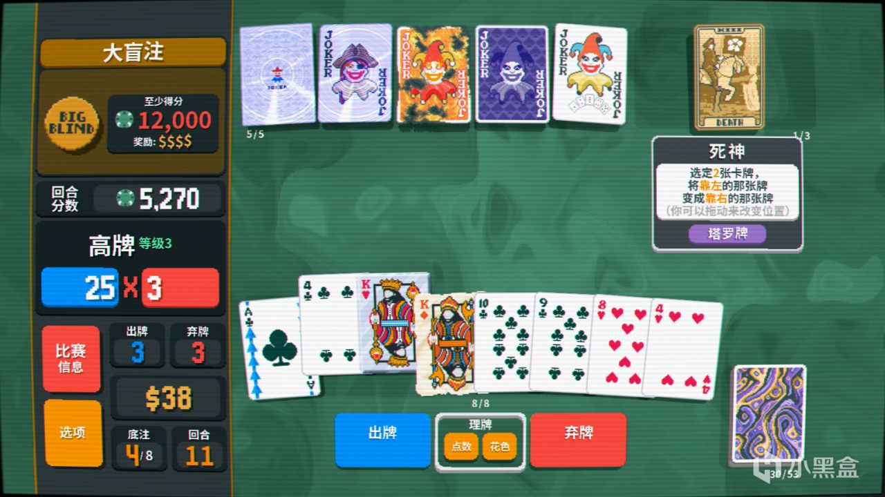 一個簡單的例子:玩家可以拖動改變牌的順序,並用“死神”牌將點數低的牌改造爲倍率更高的牌