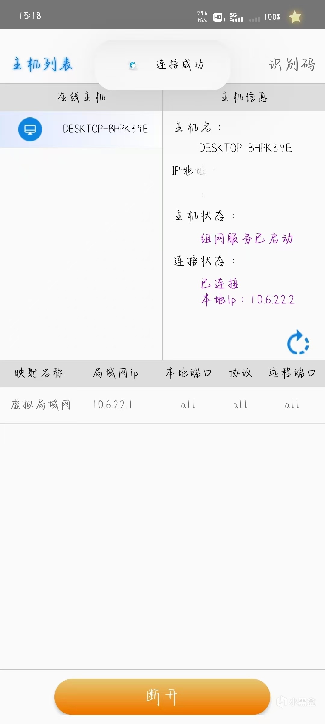 到這裏皎月連的配置就好了。moonlight和sunshine只需要跟第一種使用公網IPv6的方法中配置一模一樣即可。然後在手機端的moonlight中添加主機的IP地址改成皎月連創建的虛擬IP地址(一般爲10.6.22.1)即可。