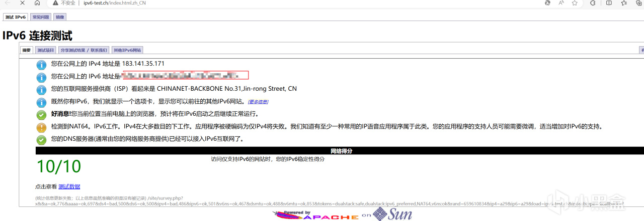 這個得分需要10分纔行,若是沒有10分可以關閉路由器防火牆多試幾次。若沒有紅框的ip,請聯繫家裏寬帶的運營商,查詢。複製圖中紅框內的ip地址(這便是我們ipv6串流所需要的ip,也是手機端的moonlight中要添加的主機ip)。