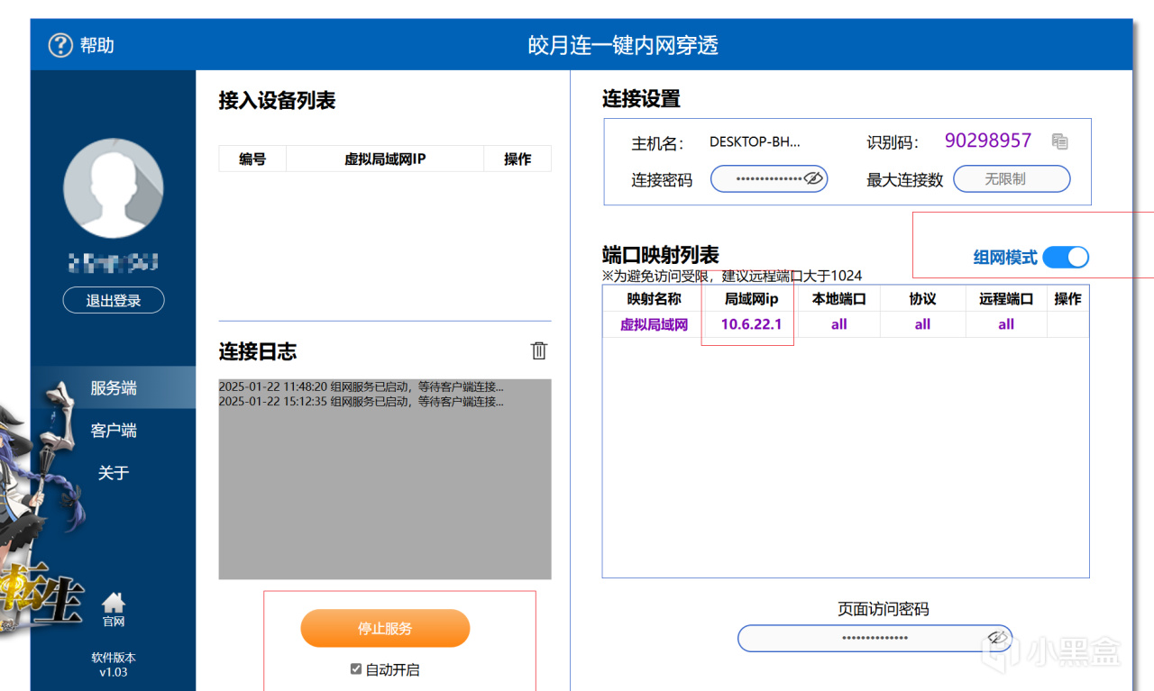 登陸成功後——左側服務端——設置連接密碼、訪問密碼——開啓組網模式——勾選自動開啓——啓動服務——記住局域網ip(10.6.22.1)