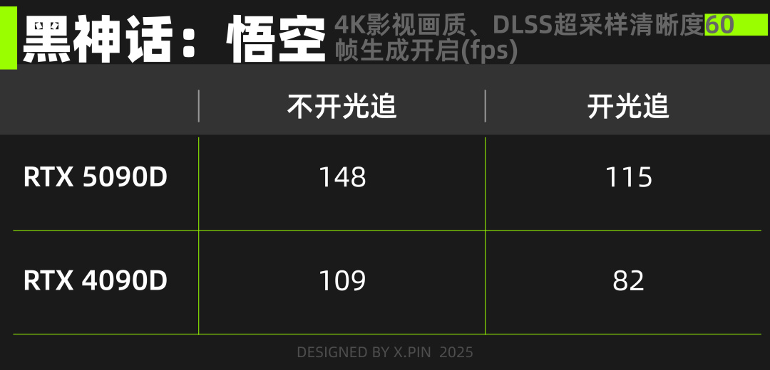 需要說明的一點是,我們測試的時候黑猴還沒有適配最新的 DLSS 4 ,所以正好測試下 5090D 針對 DLSS 3.5 環境的提升,而測出來的 4 組數據也挺讓人意外的——壓根沒有之前 PPT 裏說的翻倍提升,並且在畫質拉滿、開光追的情況下, 5090D 也跑不滿 60 幀。