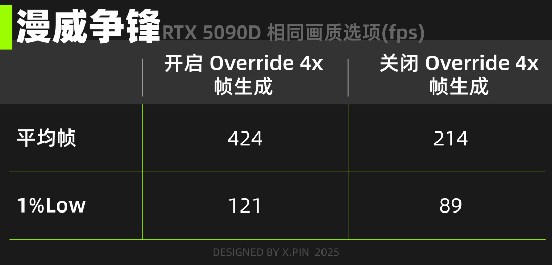 在同樣的畫質下, 5090D 開啓 Override 4x 幀生成功能後,平均幀是 424 幀,要比不開這個功能的幀數( 214 幀 )高出 98% 。同時, 1% Low 幀也高出個 36%( 從 89 幀提升到 121 幀 )。