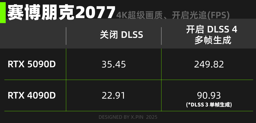 在 DLSS 4 多幀生成的加持下, 5090D 的幀數直接就是前代的二點多倍。