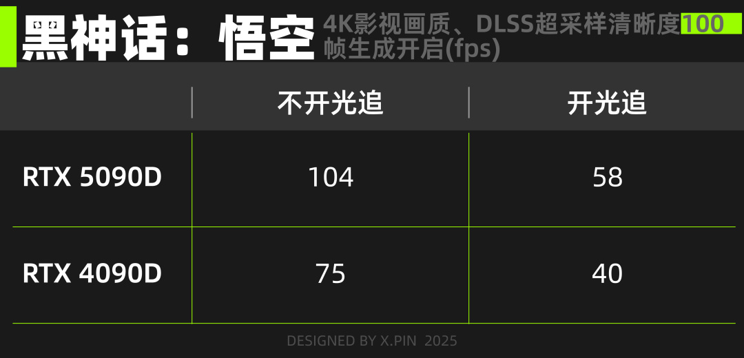 而在負載更高的檔位下( 4K 影視級畫質、 DLSS 超採樣清晰度 100 ,幀生成開啓 ),不開光追, 5090D 的平均幀爲 104 幀,比 4090D 提升了 39% 。開了光追後, 5090D 爲 58 幀,比前代( 40 幀 )提升了 45% 。