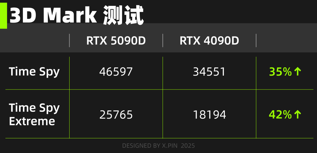 而在渲染壓力更高的 Time Spy EXtreme 測試下, 5090D 是 25765 分,對比 4090D 提升了約 42% 。