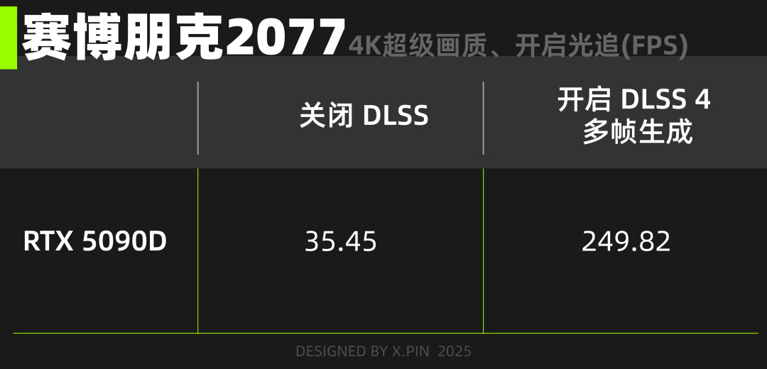而當你打開這回的 DLSS 4 多幀生成後,你就會發現老黃的魔法來了,5090D 的幀數直接暴漲到 249.82 幀,對比原來的幀數差不多是 7 倍的提升啊!