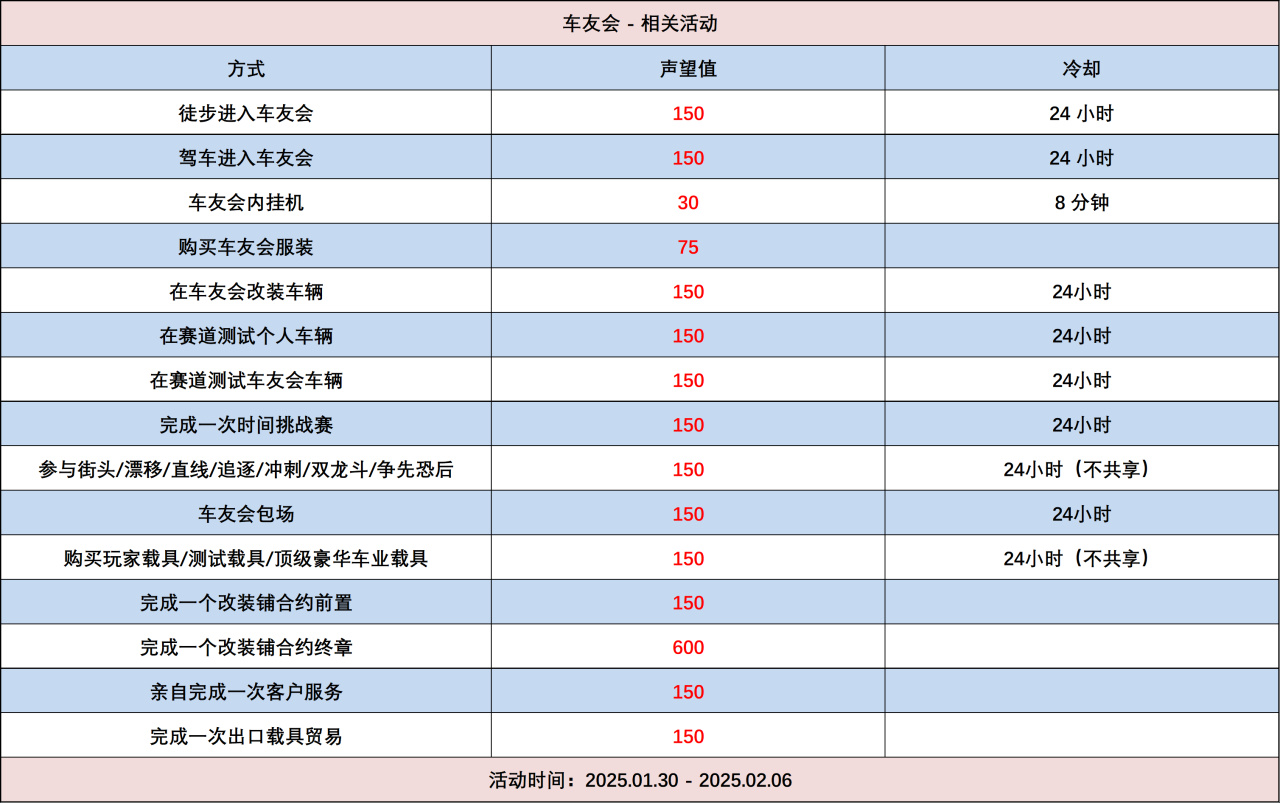 此外,徒步和駕車的每日任務可以疊加完成;掛機時穿着車友會服裝,可以獲得雙倍聲望值。客戶服務需要本人去送車;載具出口任務每日最多完成 10 次;連續 7/14/21 天拜訪車友會,還能額外獲得聲望值。