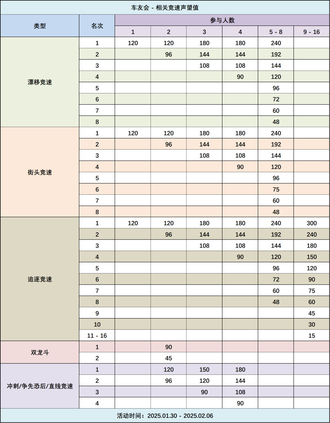 車友會比賽的獎勵,是可以重複獲取。街頭競速 5 - 8 人蔘與時獲得的聲望不變,而追逐系列在 9 - 16 人蔘與時獲得的聲望不變。利用本週的三倍加成和完成每日/比賽任務,很快就能解鎖那些令人又愛又恨的肝帝獎勵了。