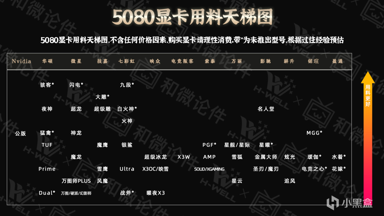 大家好,歡迎來到和微論件,本期視頻將對目前國內市場主流品牌的5080顯卡用料進行全面的刨析,品牌涵蓋了華碩、微星、技嘉、七彩虹、索泰、銘瑄、映衆、電競叛客、影馳、盈通、萬麗、耕升。