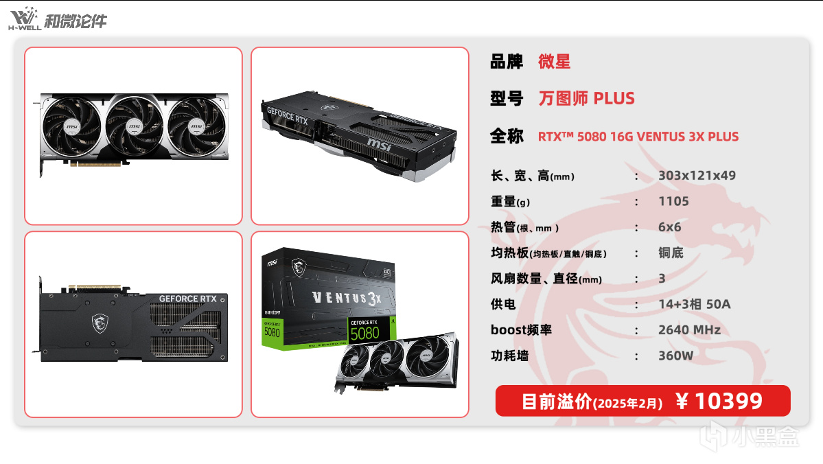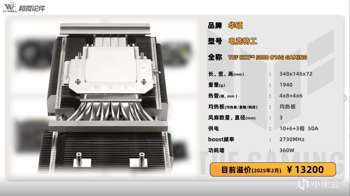 最後看Prime大師 5080,使用了6根6mm熱管搭配均熱板,供電爲10+4+3相,供電是5080的基礎款,散熱這邊在5080整體的中下水平,也算是符合Prime系列的定位吧,目前溢價在11500左右,基本是其他品牌的次旗艦水平。